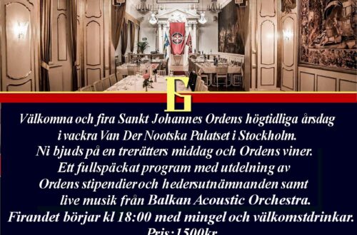 Ordens årsdag firas i Stockholm STOCKHOLM 2020-01-25 GP Lördagen den 25 januari firade Sankt Johannes Orden sin högtidliga årsdag på vackra Van Der Nootska palatset i Stockholm. Högtiden firas varje år i januari månad till minne av Johannes Ordens grundande och dess skyddshelgon Johannes Döparen. Medlemmar och vänner samlades från både Sverige och övriga Europa. Gästerna samlades först till ett förmingel i palatsets vackra salar för att sedan sätta sig till bords i palatsets stora balsal, Swedenborgssalen. Högtiden inleddes med en kort filmvisning följt av den traditionsenliga Ordens Marschen med ordförande Sasa Farkas i topp följd av två Bröder med Sveriges och Sankt Johannes fana. Ordens ordförande hälsade alla välkomna…