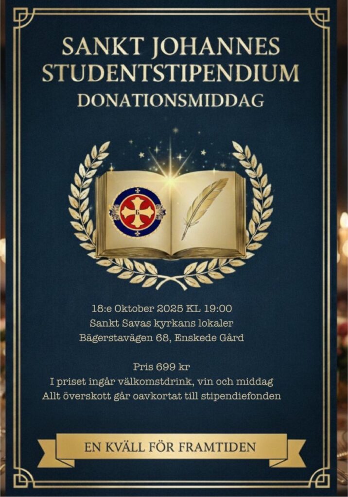 Vid middagen presenteras Sankt Johannes stipendiefond och ni får möjlighet att träffa några av mottagarna från de senaste 10 åren. Ni får höra om hur det gått i deras yrkesliv och vad stipendiet har betytt för dem. Ni bjuds på en välkomstdrink, mingel, en stor buffé samt Ordens viner. Alla insamlade medel går oavkortat till Sankt Johannes stipendiefond.